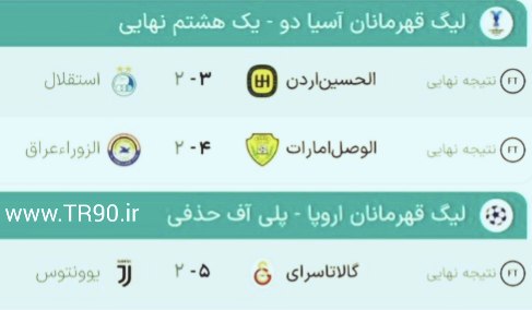 در یکطرف گالاتاسرای تیم بزرگ یوونتوس را میبرد اما در سوی دیگر تیم تاج از تیم گمنام الحسن اردن با سه گل شکست میخورد و از آسبا حذف میشود.